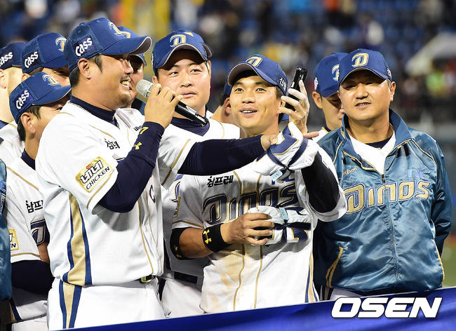 경기 종료 후 진행 된 NC 선수단의 팬들을 향한 감사 인사 시간에 주장 이호준, 이종욱, 손민한, 이혜천 등이 환하게 미소짓고 있다./dreamer@osen.co.kr