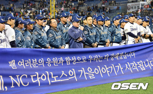경기 종료 후 진행 된 NC 선수단의 팬들을 향한 감사 인사 시간에 김경문 감독이 인사말을 하고 있다./dreamer@osen.co.kr