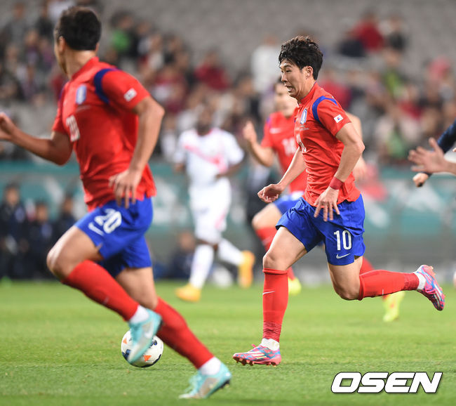 14일 오후 서울월드컵경기장에서 열린 한국과 코스타리카의 평가전,후반 손흥민이 문전돌파를 하고 있다.