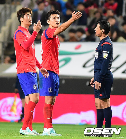 14일 오후 서울월드컵경기장에서 열린 한국과 코스타리카의 평가전 경기 후반 기성용과 이동국이 두아르테의 골 판정에 항의하고 있다.