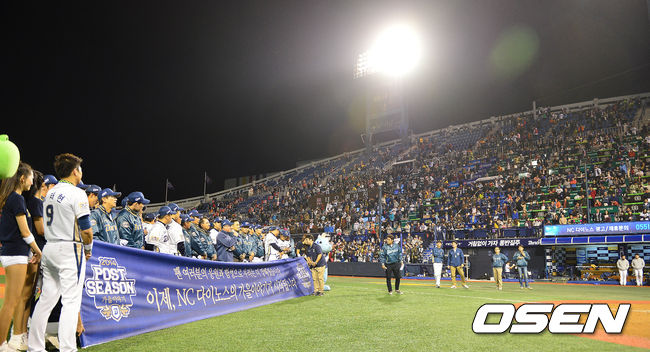 경기 종료 후 진행 된 NC 선수단의 팬들을 향한 감사 인사 시간에 선수들과 코칭스태프가 인사말을 준비하고 있다./dreamer@osen.co.kr