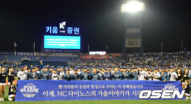 경기 종료 후 진행 된 NC 선수단의 팬들을 향한 감사 인사 시간에 선수단과 코칭스태프가 파이팅을 외치고 있다./dreamer@osen.co.kr