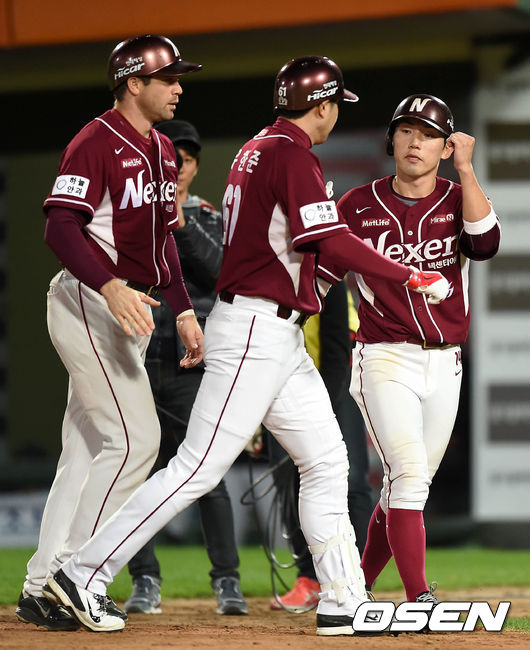 9회초 2사 2,3루에서 넥센 유한준이 좌중월 스리런 홈런을 치고 로티노, 서건창과 하이파이브를 하고 있다.