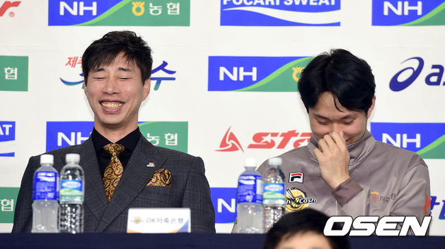 OK저축은행 김세진과 이민규가 우리카드 문용관 감독의 농담에 웃음 짓고 있다.