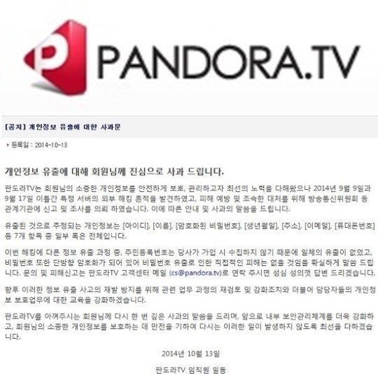 판도라TV는 15일 홈페이지에 게시한 사과문을 통해 "9월9일과 9월17일 양일간 특정 서버의 외부 해킹 흔적을 발견해 피해 예방과 조속한 대처를 위해 방송통신위원회와 관계기관에 신고·조사를 의뢰했다"며 "이에 따른 안내와 사과의 말씀을 드린다"고 밝혔다.
