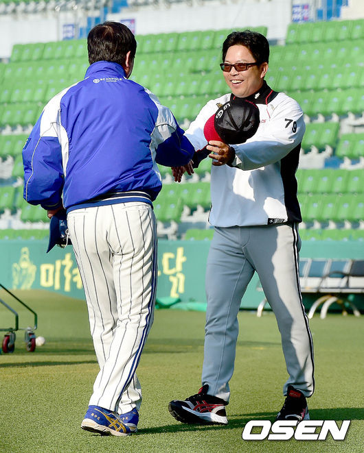 15일 오후 대구구장에서 열리는 '2014 한국야쿠르트 세븐 프로야구' 삼성 라이온즈와 LG 트윈스의 경기를 앞두고, 삼성 류중일 감독과 LG 양상문 감독이 인사를 나누고 있다.