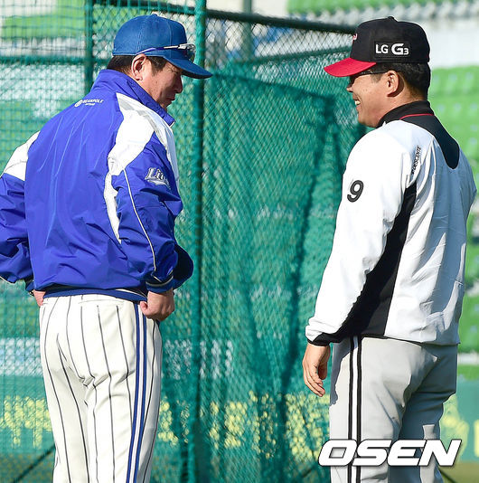 15일 오후 대구구장에서 열리는 '2014 한국야쿠르트 세븐 프로야구' 삼성 라이온즈와 LG 트윈스의 경기를 앞두고, 삼성 류중일 감독과 LG 양상문 감독이 인사를 나누고 있다.