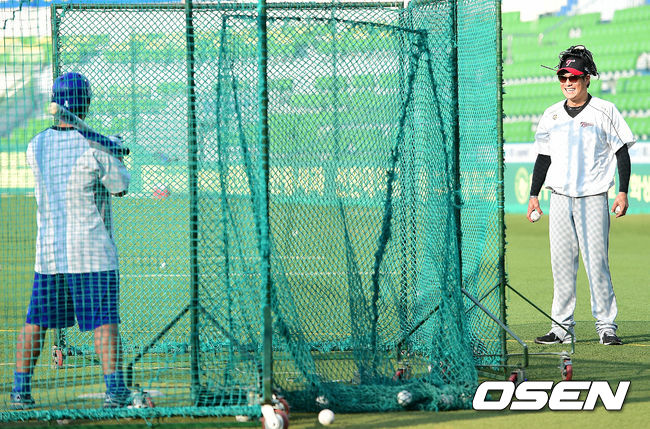 15일 오후 대구구장에서 열리는 '2014 한국야쿠르트 세븐 프로야구' 삼성 라이온즈와 LG 트윈스의 경기를 앞두고, LG 이동현과 삼성 김태완이 인사를 나누고 있다.