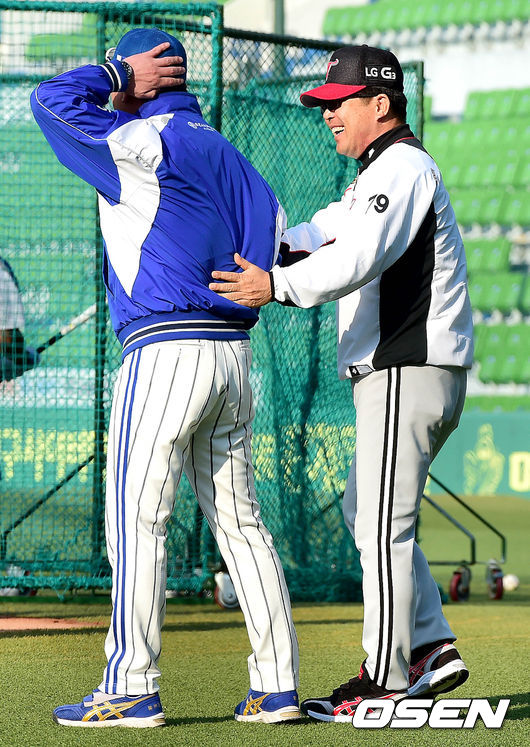 15일 오후 대구구장에서 열리는 '2014 한국야쿠르트 세븐 프로야구' 삼성 라이온즈와 LG 트윈스의 경기를 앞두고, LG 양상문 감독과 삼성 류중일 감독이 인사를 나누고 있다.