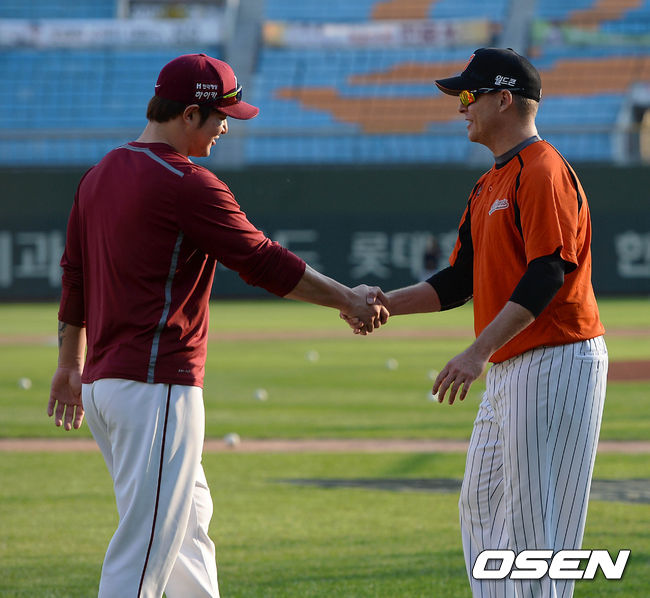 15일 오후 부산 사직야구장에서 진행될 '2014 한국야쿠르트 세븐 프로야구' 롯데 자이언츠와 넥센 히어로즈의 경기에 앞서 넥센 박병호와 롯데 옥스프링이 악수를 나누고 있다.