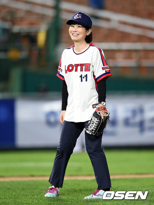 경기에 앞서 김희정 여성가족부 장관이 시구를 마치고 미소를 짓고 있다.