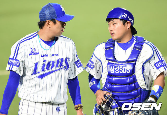 3회초 LG 공격을 무실점으로 막아낸 삼성 선발 윤성환과 포수 이지영이 더그아웃으로 들어오며 대화를 나누고 있다.