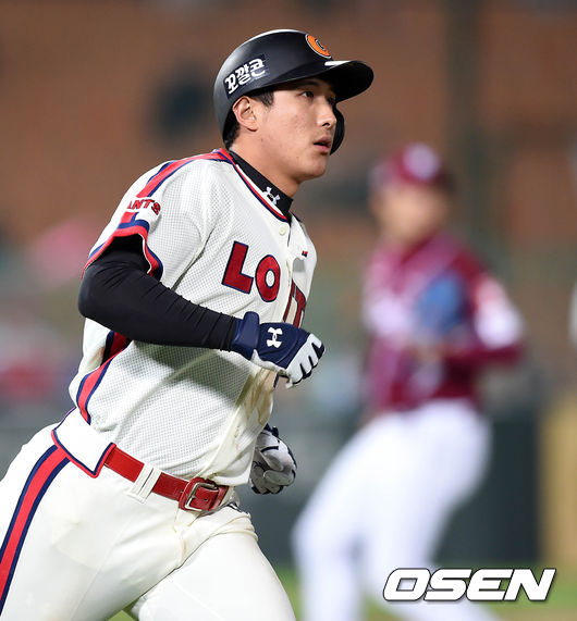 2회말 무사 2,3루에서 롯데 황재균이 우전 적시 2루타를 치고 그라운드를 달리고 있다.