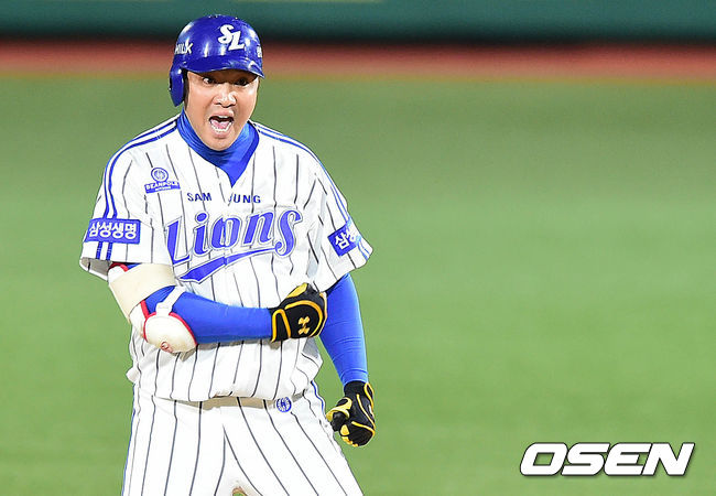 3회말 삼성 공격 2사 2, 3루 상황 채태인이 2타점 우중간 2루타를 날리고 2루에 안착해 포효하고 있다.