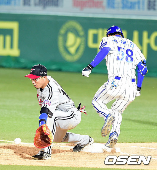 4회말 삼성 공격 2사 주자없는 상황 박해민이 내야 안타를 치고 1루까지 달려 세이프되고 있다. LG 1루수는 정성훈.