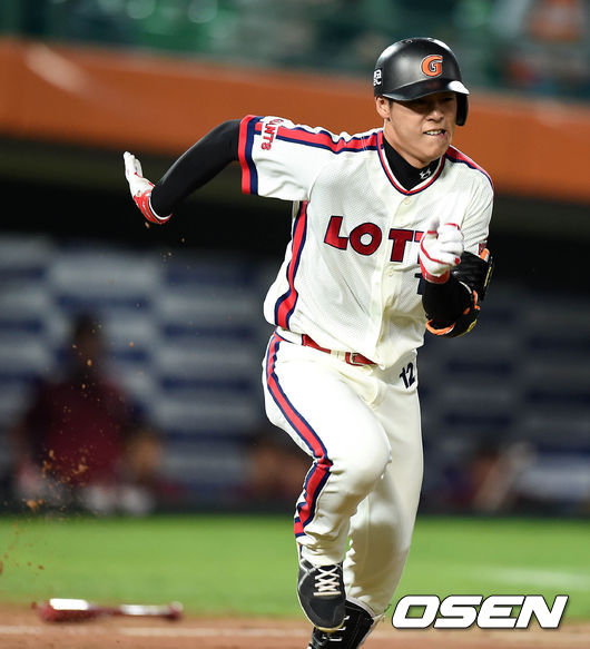 2회말 무사 1루에서 롯데 김민하가 좌전 2루타를 치고 그라운드를 달리고 있다.