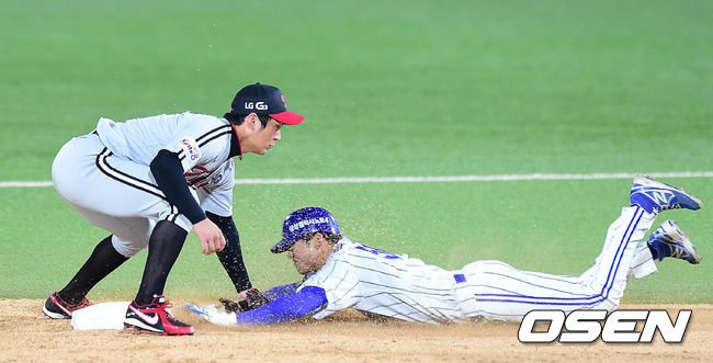 4회말 삼성 공격 2사 1루 상황 박해민이 2루 도루를 시도하다 LG 유격수 오지환의 태그에 걸려 아웃되고 있다.