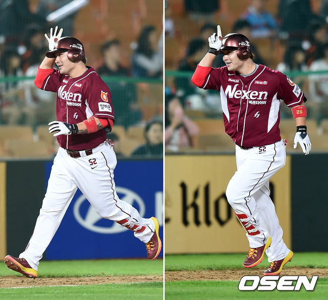 5회초 1사 1,2루에서 넥센 박병호가 좌월 스리런 홈런을 치고 세리머니를 하고 있다.