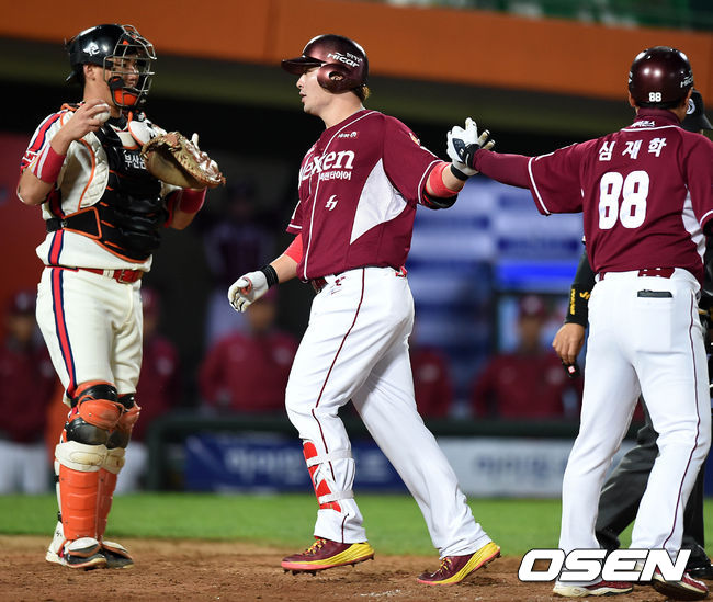 5회초 1사 1,2루에서 넥센 박병호가 좌월 스리런 홈런을 치고 홈에서 심재학 코치와 하이파이브를 하고 있다.