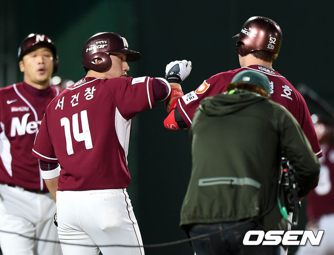 5회초 1사 1,2루에서 넥센 박병호가 좌월 스리런 홈런을 치고 홈을 밟은 서건창과 하이파이브를 하고 있다.