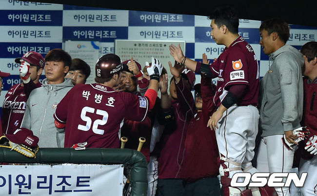5회초 1사 1,2루에서 넥센 박병호가 좌월 스리런 홈런을 치고 더그아웃에서 동료들과 환호하고 있다.
