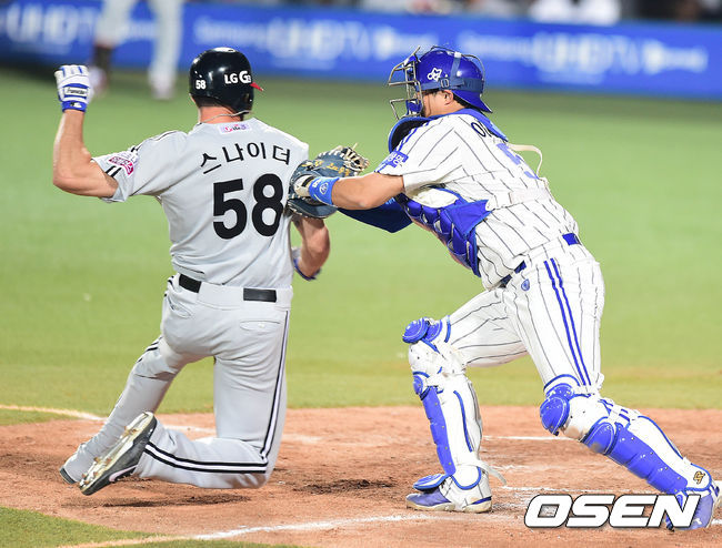 7회초 LG 공격 1사 3루 상황 정성훈의 내야 땅볼 때 3루 주자 스나이더가 홈으로 쇄도했지만 삼성 포수 이지영의 태그에 거려 아웃되고 있다.