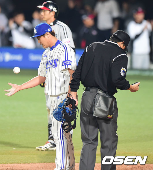 7회초 LG 공격 2사 3루 상황 삼성 투수 안지만의 폭투로 3루 주자 정성훈이 홈을 밟으며 동점이 됐다. 아쉬워하는 삼성 투수 안지만.