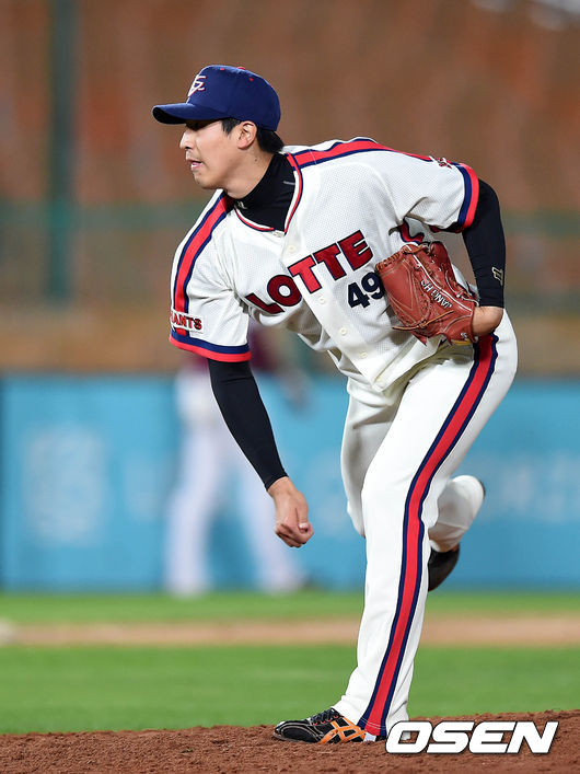8회초 롯데 배장호가 힘차게 공을 던지고 있다.
