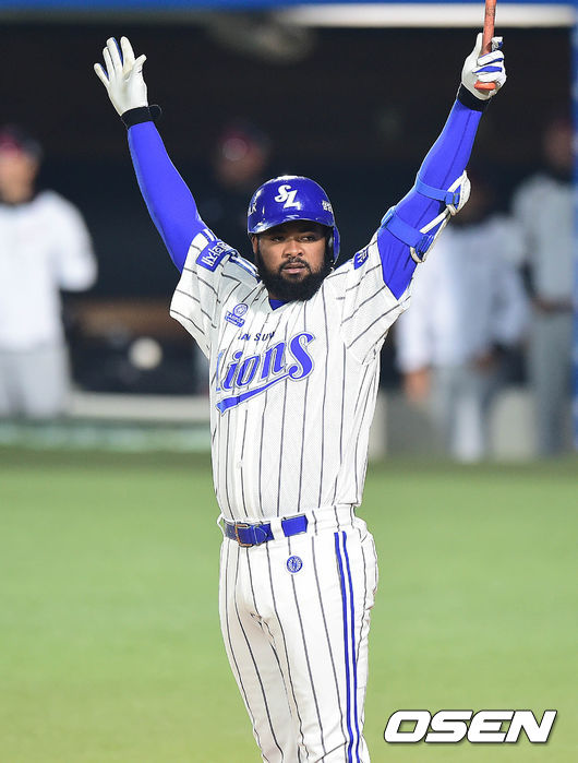 8회말 삼성 공격 1사 주자없는 상황 나바로가 달아나는 좌월 솔로포를 날리고 손을 번쩍 들며 환호하고 있다.