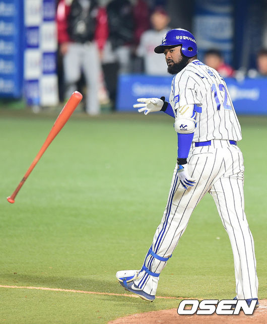 8회말 삼성 공격 1사 주자없는 상황 나바로가 달아나는 좌월 솔로포를 날리고 배트를 던지며 1루로 향하고 있다.