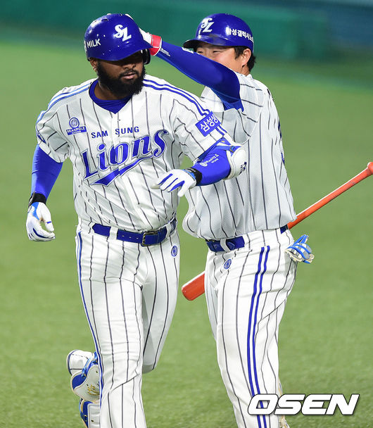 8회말 삼성 공격 1사 주자없는 상황 나바로가 달아나는 좌월 솔로포를 날리고 홈을 밟은 뒤 박한이와 인사를 나누고 있다.