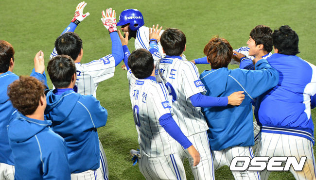 8회말 삼성 공격 1사 주자없는 상황 나바로가 달아나는 좌월 솔로포를 날리고 더그아웃 동료들과 인사를 나누고 있다.