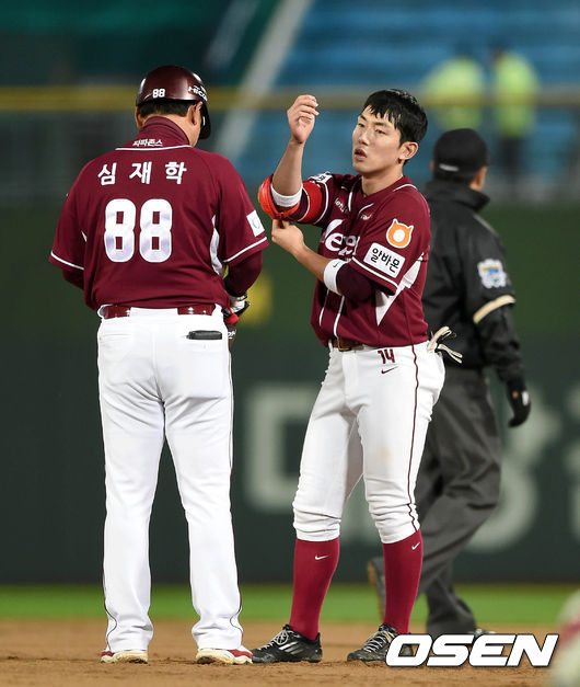 8회초 2사 1,3루에서 넥센 서건창이 내야땅볼을 치고 심재학 코치와 이야기를 나누고 있다.
