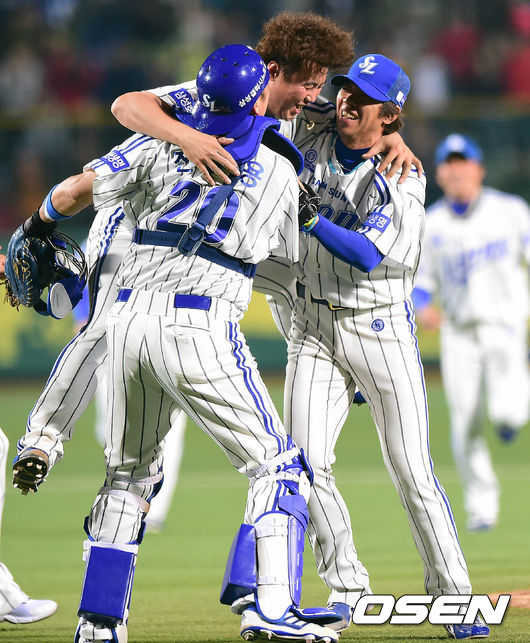 경기 종료 직후 삼성 안지만, 진갑용, 임창용이 서로 포옹하며 정규 시즌 우승을 만끽하고 있다./dreamer@osen.co.kr