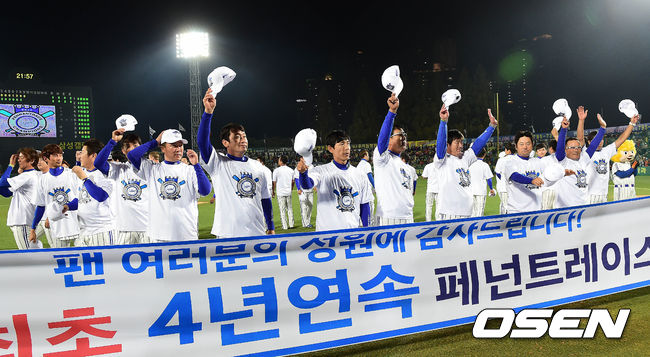 삼성 라이온즈는 15일 대구구장에서 열린 LG와의 경기에서 5-3으로 승리하며 2014년 페넌트레이스 우승 매직넘버를 소멸시켰다. 지난 2011년 이후 4년 연속 정규시즌 우승이다. 지난해 이미 사상 최초로 3년 연속 정규시즌 우승이란 신기록을 달성한 삼성 라이온즈는 그 기록을 4시즌으로 확장시켰다.
