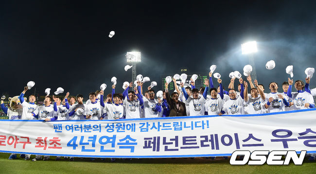 삼성 라이온즈는 15일 대구구장에서 열린 LG와의 경기에서 5-3으로 승리하며 2014년 페넌트레이스 우승 매직넘버를 소멸시켰다. 지난 2011년 이후 4년 연속 정규시즌 우승이다. 지난해 이미 사상 최초로 3년 연속 정규시즌 우승이란 신기록을 달성한 삼성 라이온즈는 그 기록을 4시즌으로 확장시켰다.