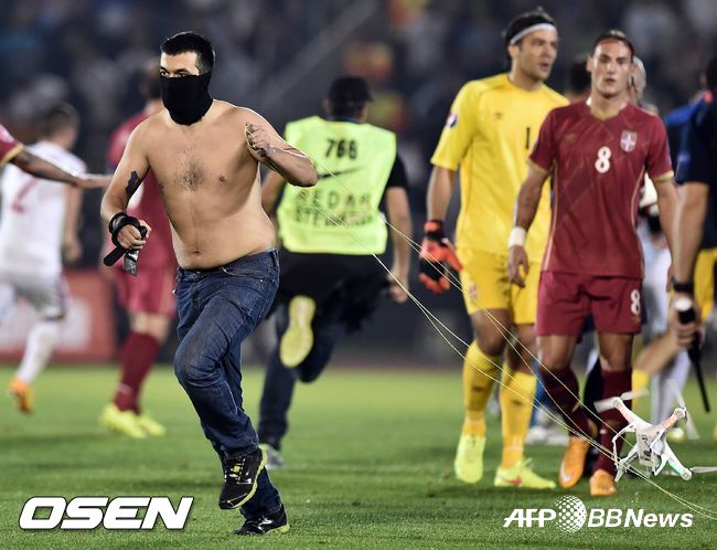 전반 종료 5분 전까지도 순조롭게 진행됐던 경기였다. 0-0으로 팽팽하던 그 때 갑자기 알바니아 국기와 알바니아 건국 영웅 등을 그린 깃발을 단 무인기가 경기장 상공으로 날아들었다.