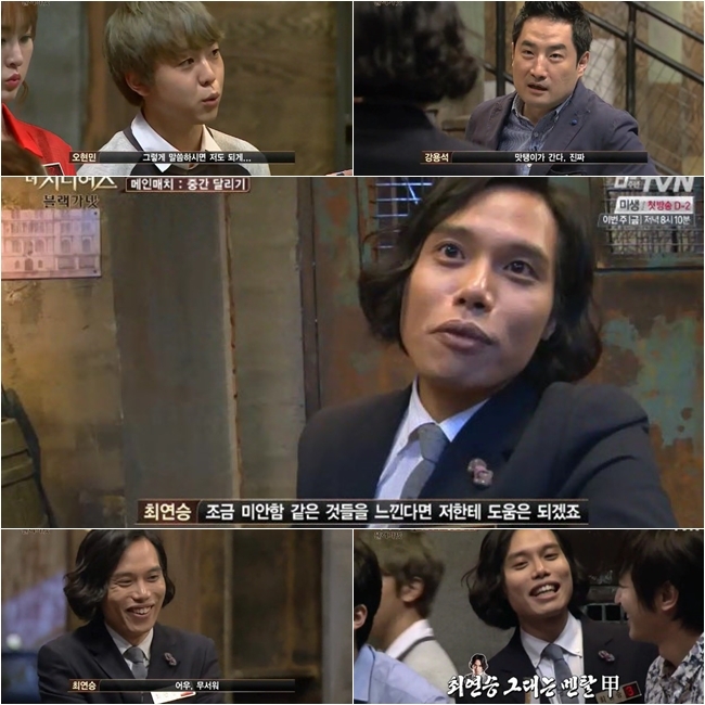 최연승은 그렇게 꼴등이 돼 데스매치에 올랐다. 그는 “감정적으로는 서운하긴 하죠. 근데 게임이니까 멘탈이 무너지면 오히려 데스매치에서 무너질 수 있으니까”라고 담담하게 말하며 평상심을 유지했다. 그러면서 “사람들이 심리적인 부채를 느꼈으면 좋겠다”며 조금이라도 미안함을 느낀다면 앞으로 자신에게 도움이 되지 않겠냐고 낙관적인 모습을 보였다. 이렇게 최연승은 자신이 타깃임을 알고 있음에도 억울함을 대중에 호소하고, ‘어그로를 끈다’ 등의 인터넷 용어를 남발하며 밝은 모습을 보여 눈길을 사로잡았다. 결국 멘탈 갑 최연승은 강용석과의 데스매치 대결에서 승리해 살아남았다.