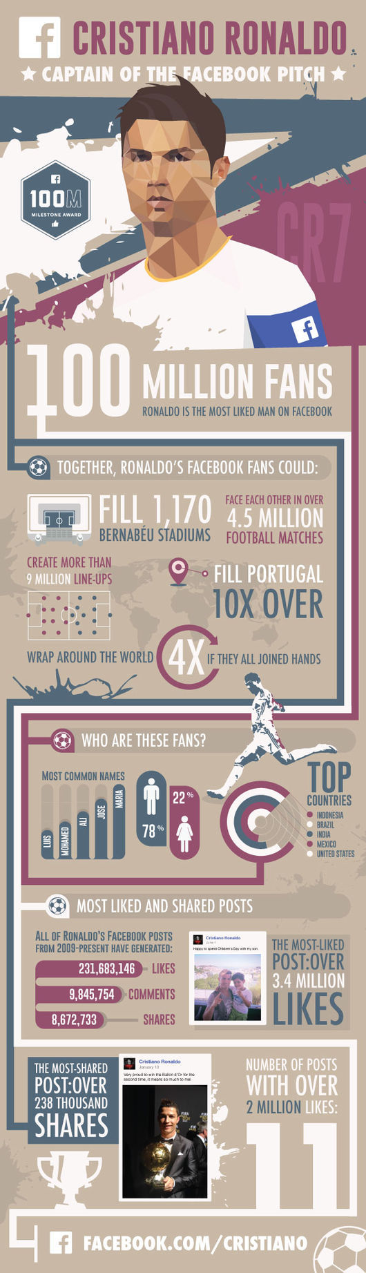 페이스북은 또한 호날두의 공식 페이스북 페이지 좋아요 1억건 돌파를 기념, 인포그래픽을 제작해 공개했다. 인포그래픽에 따르면 호날두의 공식 페이스북 페이지에 좋아요를 누른 사용자들을 한 데 모으면, 호날두의 소속팀 레알마드리드의 홈구장인 산티아고 베르나베우 스타디움을 총 1170번 채울 수 있으며, 다 함께 손을 잡았을 때 지구를 네 바퀴 돌 수 있는 수준이다. 호날두의 공식 페이스북 페이지에 가장 많은 좋아요를 보낸 국가는 인도네시아로 나타났으며 브라질, 인도, 멕시코, 미국 등이 뒤를 이었다.