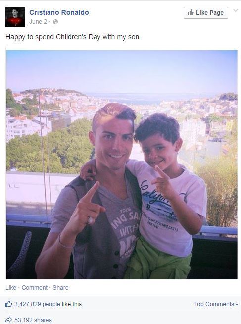 페이스북에 따르면, 호날두가 페이스북을 시작한 2009년 이후 가장 많은 좋아요를 받은 페이스북 사진은 지난 여름 호날두가 아들과 함께 찍은 사진이다. 어린이날을 기념하기 위해 촬영한 이 사진에는 무려 340만 건이 넘는 좋아요가 눌렸다. 또한, 페이스북 상에서 가장 많이 공유된 호날두의 사진은 지난 1월 13일 FIFA 발롱도르를 수상한 직후의 사진으로, 23만 8천번 이상 공유됐다고 페이스북은 밝혔다.