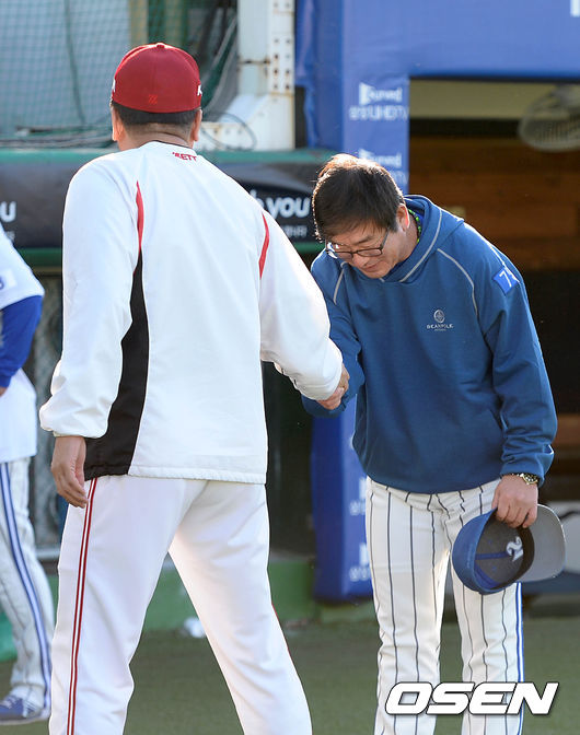 16일 오후 대구시민운동장야구장에서 진행될 '2014 한국야쿠르트 세븐 프로야구' 삼성 라이온즈와 KIA 타이거즈의 경기에 앞서 삼성 류중일 감독과 KIA 선동렬 감독이 악수를 나누고 있다.
