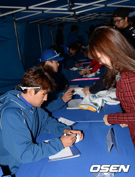 16일 오후 대구시민운동장야구장에서 진행될 '2014 한국야쿠르트 세븐 프로야구' 삼성 라이온즈와 삼성 선수들이 팬사인회를 갖고 있다.