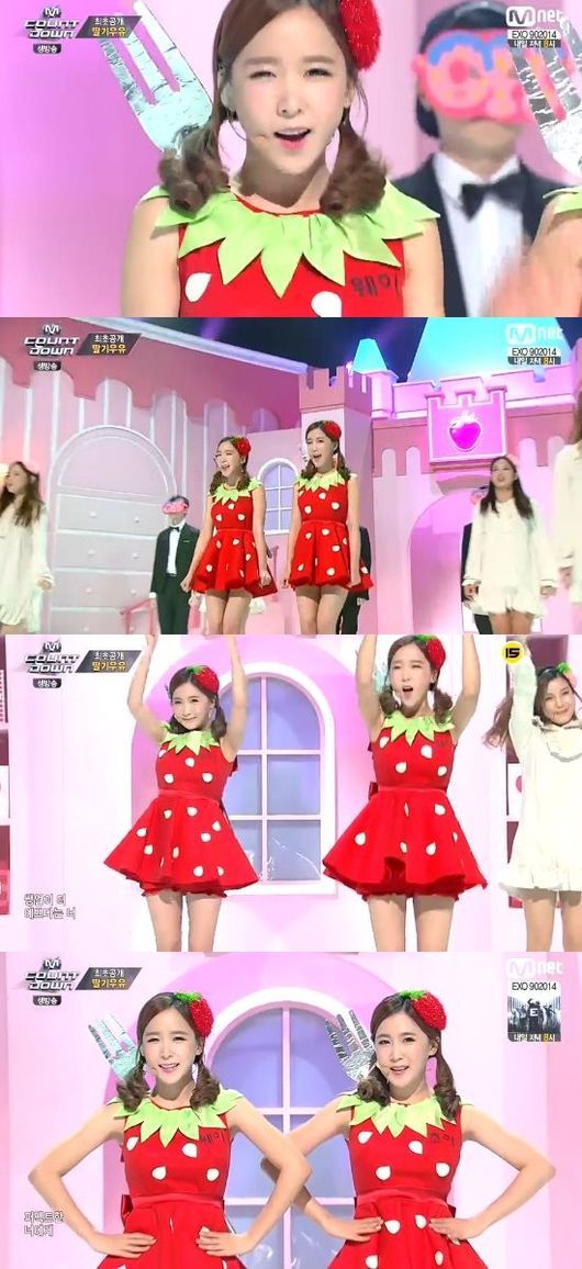 걸그룹 크레용팝의 쌍둥이 유닛 딸기우유가 중독성 강한 첫 무대를 마쳤다.