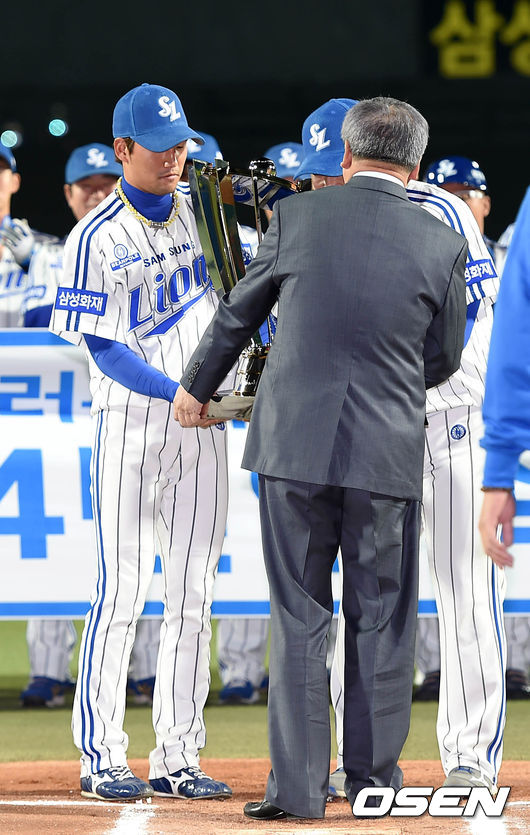 16일 오후 대구시민운동장야구장에서 진행될 '2014 한국야쿠르트 세븐 프로야구' 삼성 라이온즈와 KIA 타이거즈의 경기에 앞서 삼성 김상수와 최형우가 구본능 KBO 총재로부터 우승트로피를 건네받고 있다.