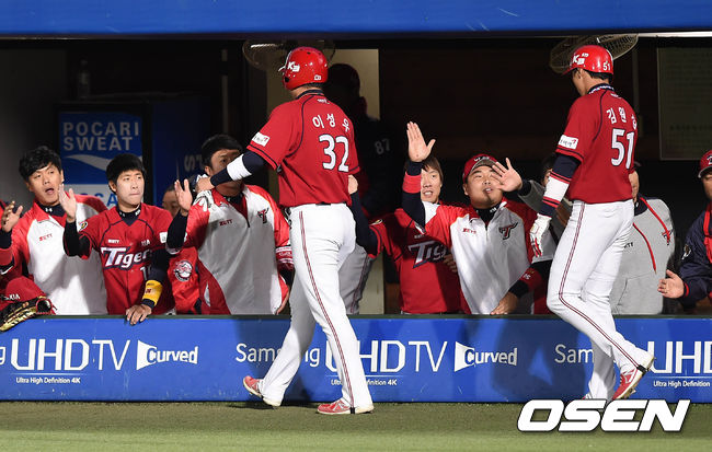 2회초 2사 1,3루에서 KIA 이대형의 우중간을 가르는 적시 3루타때 홈을 밟은 3루주자 김원섭과 1루주자 이성우가 더그아웃에서 동료들과 하이파이브를 하고 있다.