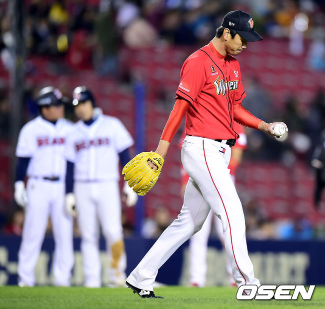 16일 오후 서울 잠실야구장에서 '2014 한국야쿠르트 세븐 프로야구' 두산 베어스와 SK 와이번스의 경기가 열렸다. 3회말 무사 1,2루 SK 김광현이 두산 김현수에게 적시타를 허용한 뒤 아쉬워하고 있다. 4강 진출 좌절 위기인 SK 와이번스가 최후의 보루를 꺼내들었다. SK가 포스트시즌에 진출하기 위해서는 남은 2경기에서 모두 승리해야만 하고, LG가 남은 1경기에서 패해야만 한다. 양 팀 중 한 팀이라도 무승부가 발생하면 4위는 LG가 차지한다. 그야말로 벼랑 끝에 선 SK는 에이스 김광현을 내세웠다. 김광현은 아시안게임 대표팀에서 복귀한 뒤 2경기에서 썩 좋지만은 않았다. 11이닝 동안 4실점(3자책)으로 대량 실점은 피했지만, 볼넷이 10개나 될 정도로 투구 내용은 만족스럽지 못했다. 그래도 가장 어려운 순간에도 고민하지 않고 내보낼 수 있는 투수라는 점에는 변함이 없다. 김광현에 맞서는 두산 선발은 이현승이다. 이현승도 올해 선발로 나선 최근 2경기 성적이 들쭉날쭉하다. 지난 5일 마산 NC전에서는 5이닝 2실점으로 호투했지만, 4일 휴식 후 치른 10일 대전 한화전에서는 1⅓이닝 2실점하고 조기 강판됐다. / youngrae@osen.co.kr