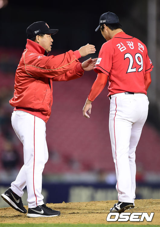 16일 오후 서울 잠실야구장에서 '2014 한국야쿠르트 세븐 프로야구' 두산 베어스와 SK 와이번스의 경기가 열렸다. 7회말 무사 2루 SK 이만수 감독이 마운드에 올라 김광현을 교체시키고 있다. 4강 진출 좌절 위기인 SK 와이번스가 최후의 보루를 꺼내들었다. SK가 포스트시즌에 진출하기 위해서는 남은 2경기에서 모두 승리해야만 하고, LG가 남은 1경기에서 패해야만 한다. 양 팀 중 한 팀이라도 무승부가 발생하면 4위는 LG가 차지한다. 그야말로 벼랑 끝에 선 SK는 에이스 김광현을 내세웠다. 김광현은 아시안게임 대표팀에서 복귀한 뒤 2경기에서 썩 좋지만은 않았다. 11이닝 동안 4실점(3자책)으로 대량 실점은 피했지만, 볼넷이 10개나 될 정도로 투구 내용은 만족스럽지 못했다. 그래도 가장 어려운 순간에도 고민하지 않고 내보낼 수 있는 투수라는 점에는 변함이 없다. 김광현에 맞서는 두산 선발은 이현승이다. 이현승도 올해 선발로 나선 최근 2경기 성적이 들쭉날쭉하다. 지난 5일 마산 NC전에서는 5이닝 2실점으로 호투했지만, 4일 휴식 후 치른 10일 대전 한화전에서는 1⅓이닝 2실점하고 조기 강판됐다. / youngrae@osen.co.kr