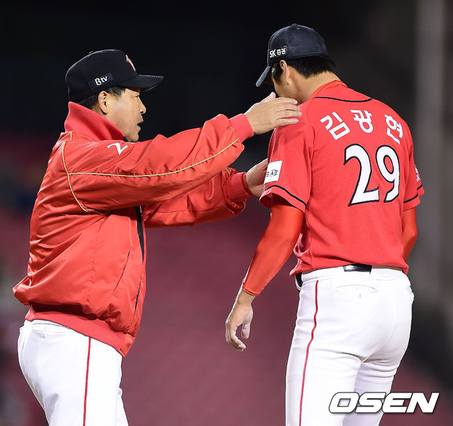 16일 오후 서울 잠실야구장에서 '2014 한국야쿠르트 세븐 프로야구' 두산 베어스와 SK 와이번스의 경기가 열렸다. 7회말 무사 2루 SK 이만수 감독이 마운드에 올라 김광현을 교체시키고 있다. 4강 진출 좌절 위기인 SK 와이번스가 최후의 보루를 꺼내들었다. SK가 포스트시즌에 진출하기 위해서는 남은 2경기에서 모두 승리해야만 하고, LG가 남은 1경기에서 패해야만 한다. 양 팀 중 한 팀이라도 무승부가 발생하면 4위는 LG가 차지한다. 그야말로 벼랑 끝에 선 SK는 에이스 김광현을 내세웠다. 김광현은 아시안게임 대표팀에서 복귀한 뒤 2경기에서 썩 좋지만은 않았다. 11이닝 동안 4실점(3자책)으로 대량 실점은 피했지만, 볼넷이 10개나 될 정도로 투구 내용은 만족스럽지 못했다. 그래도 가장 어려운 순간에도 고민하지 않고 내보낼 수 있는 투수라는 점에는 변함이 없다. 김광현에 맞서는 두산 선발은 이현승이다. 이현승도 올해 선발로 나선 최근 2경기 성적이 들쭉날쭉하다. 지난 5일 마산 NC전에서는 5이닝 2실점으로 호투했지만, 4일 휴식 후 치른 10일 대전 한화전에서는 1⅓이닝 2실점하고 조기 강판됐다. / youngrae@osen.co.kr