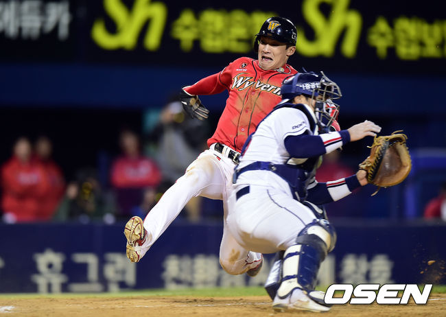 16일 오후 서울 잠실야구장에서 '2014 한국야쿠르트 세븐 프로야구' 두산 베어스와 SK 와이번스의 경기가 열렸다. 연장 10회초 무사 2,3루 SK 박계현이 조동화의 우익수 희생플라이때 홈으로 쇄도하고 있다. 4강 진출 좌절 위기인 SK 와이번스가 최후의 보루를 꺼내들었다. SK가 포스트시즌에 진출하기 위해서는 남은 2경기에서 모두 승리해야만 하고, LG가 남은 1경기에서 패해야만 한다. 양 팀 중 한 팀이라도 무승부가 발생하면 4위는 LG가 차지한다. 그야말로 벼랑 끝에 선 SK는 에이스 김광현을 내세웠다. 김광현은 아시안게임 대표팀에서 복귀한 뒤 2경기에서 썩 좋지만은 않았다. 11이닝 동안 4실점(3자책)으로 대량 실점은 피했지만, 볼넷이 10개나 될 정도로 투구 내용은 만족스럽지 못했다. 그래도 가장 어려운 순간에도 고민하지 않고 내보낼 수 있는 투수라는 점에는 변함이 없다. 김광현에 맞서는 두산 선발은 이현승이다. 이현승도 올해 선발로 나선 최근 2경기 성적이 들쭉날쭉하다. 지난 5일 마산 NC전에서는 5이닝 2실점으로 호투했지만, 4일 휴식 후 치른 10일 대전 한화전에서는 1⅓이닝 2실점하고 조기 강판됐다. / youngrae@osen.co.kr