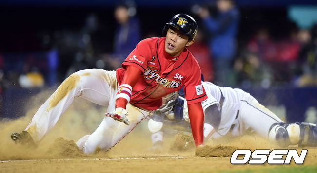 16일 오후 서울 잠실야구장에서 '2014 한국야쿠르트 세븐 프로야구' 두산 베어스와 SK 와이번스의 경기가 열렸다. 연장 10회초 1사 3루 SK 이명기가 이재원의 중견수 희생플라이때 홈으로 쇄도하고 있다. 4강 진출 좌절 위기인 SK 와이번스가 최후의 보루를 꺼내들었다. SK가 포스트시즌에 진출하기 위해서는 남은 2경기에서 모두 승리해야만 하고, LG가 남은 1경기에서 패해야만 한다. 양 팀 중 한 팀이라도 무승부가 발생하면 4위는 LG가 차지한다. 그야말로 벼랑 끝에 선 SK는 에이스 김광현을 내세웠다. 김광현은 아시안게임 대표팀에서 복귀한 뒤 2경기에서 썩 좋지만은 않았다. 11이닝 동안 4실점(3자책)으로 대량 실점은 피했지만, 볼넷이 10개나 될 정도로 투구 내용은 만족스럽지 못했다. 그래도 가장 어려운 순간에도 고민하지 않고 내보낼 수 있는 투수라는 점에는 변함이 없다. 김광현에 맞서는 두산 선발은 이현승이다. 이현승도 올해 선발로 나선 최근 2경기 성적이 들쭉날쭉하다. 지난 5일 마산 NC전에서는 5이닝 2실점으로 호투했지만, 4일 휴식 후 치른 10일 대전 한화전에서는 1⅓이닝 2실점하고 조기 강판됐다. / youngrae@osen.co.kr